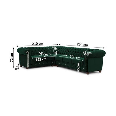 Sametová, rozkládací, chesterfield, levý roh/do L, zelená, voděodolná/odolné vůči skvrnám, čtyřmístná, šířka 264 cm