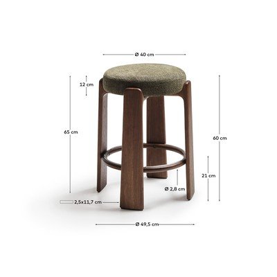 Barová stolička Granite od značky Kave Home. Pohodlné čalounění je z recyklovaného polyesteru a dřevo pochází z udržitelného lesního hospodářství.