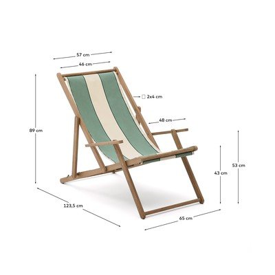 Skládací zahradní lehátko Vilara od značky Kave Home s područkami je ideální volbou pro venkovní odpočinek. Jeho látka s pruhovaným vzorem je navržena pro maximální odolnost a snadnou údržbu – je antibakteriální, rychleschnoucí, vodoodpudivá a odolná vůči UV záření.
