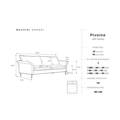 Pohovka PivoineSametová, rozkládací/s úložným prostorem, modrá, trojmístná, šířka 245 cm
