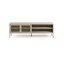 Kovový TV stolek od značky Marckeric. Nabízí praktický úložný prostor díky kombinaci uzavřených skříněk s perforovanými dvířky a otevřených polic.